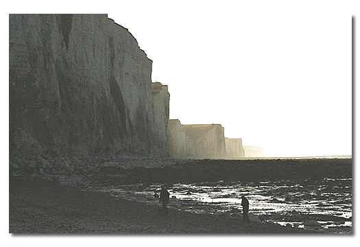 Je poursuis ma quête. Divers motifs du parcours, comme le blockhaus, les piquets et le fil barbelé, se rapprochent inexorablement du vide. Indices recoupés pour l’enquête, pour en arriver à la flagrante évidence du grignotage, au délit de harcèlement. Devant moi, le chemin interdit, qui appelle le désir. Il semble se poursuivre dans l’enfilade des falaises, se perdre dans l’échancrure des valleuses. Je n’ose plus, comme avant, le défier. De récentes chutes crayeuses incitent à la prudence. Devant moi, vers le sud, un chemin de terre bordant une forêt de maïs, des lignes de fuite noyées dans les embruns, l’ourlet nacré des falaises de Mers. Le bonheur en marchant, l’oubli des pesanteurs et le bois de Cise tout proche, à quelques encablures.