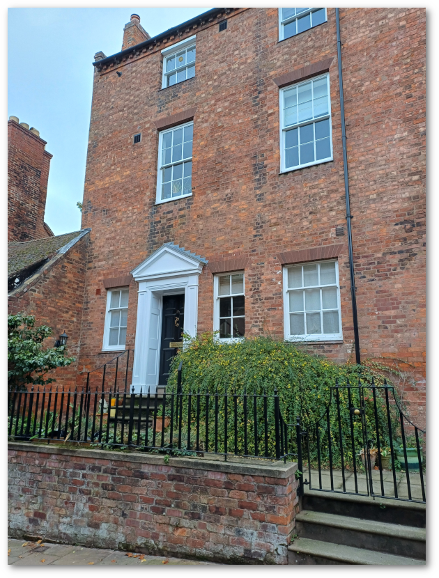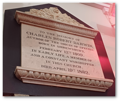 Sur le plan de ville de Shrewsbury, la plupart des lieux qui gardent la mémoire de Charles Darwin sont reproduits en grand, sauf le plus important d’entre eux qui est mentionné en tout petit : sa maison natale. La raison en est que c’est une propriété privée qui s’ouvrira peut-être un jour davantage au public. Quel dommage que ce ne soit pas encore le cas ! Cela nous prive d’une grande partie de la connaissance de la vie de la famille Darwin, surtout entre la naissance de Charles en 1809 et son départ en 1825 pour étudier la médecine à Édimbourg.